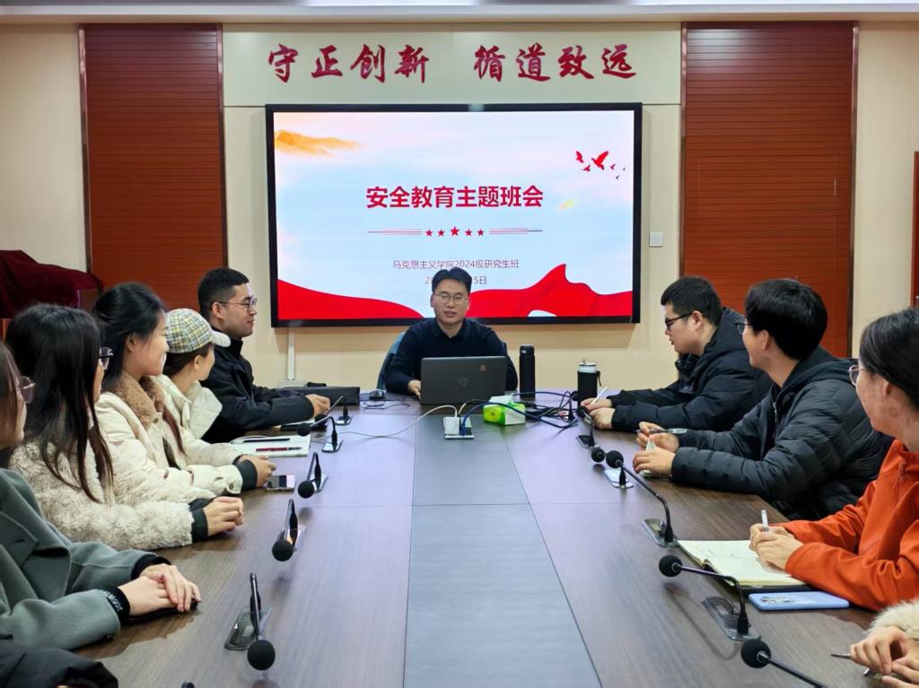 为强化研究生安全意识和责任担当,切实筑牢校园安全防线,11月5日公司通过线上线下相结合的方式,召开11月份研究生安全教育主题班会,班主任黄少雄老师主持班会,党委副书记刘志峰、辅导员周献术等老师和研究生参加班会。