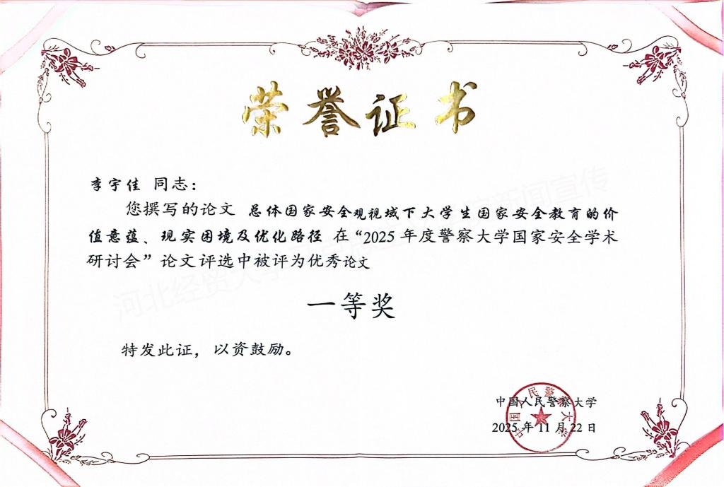 11月22日,2025年度警察大学国家安全学术研讨会在相关高校联合主办下顺利召开。本次研讨会由中国人民警察大学、pa集团官网入口、北华航天工业公司联合组织,聚焦国家安全领域的理论创新与实践探索,设置多个专题论坛为学界交流搭建优质平台。经公司推荐与研讨会学术委员会严格评审,公司2024级研究生李宇佳的论文《总体国家安全观视域下老员工国家安全教育的价值意蕴、现实困境及优化路径》脱颖而出,荣获优秀论文一等奖,其本人受邀参会并在国家安全与教育论坛中发表主题发言。
