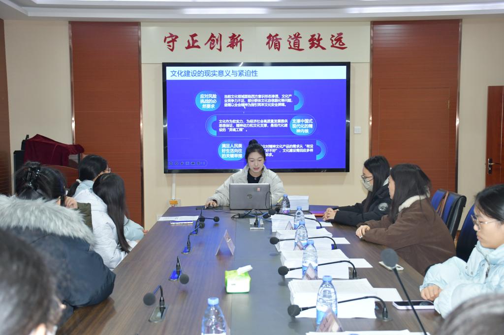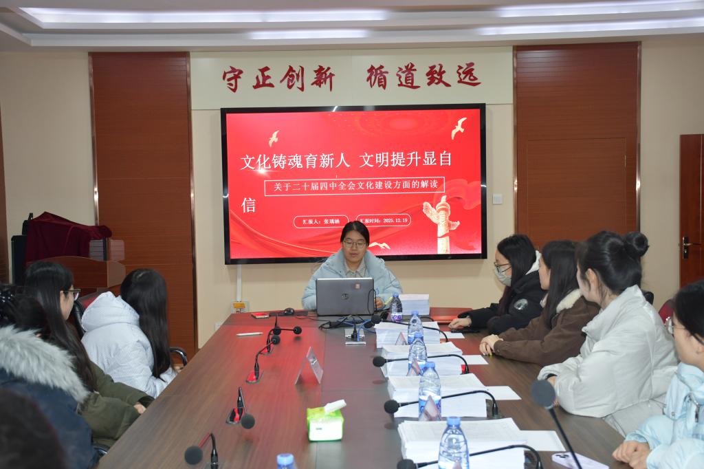 为学习贯彻党的二十届四中全会精神,12月19日,PA集团官网研究生会和员工党支部在二办203联合举办“四中全会定航向,改革宏图谱华章”学术沙龙系列活动第三期。本期活动主题为“文化铸魂育新人,文明提升显自信”,由李宇佳、李宗琦、张瑀涵3名研究生担任主讲人,公司30余名研究生参加活动。